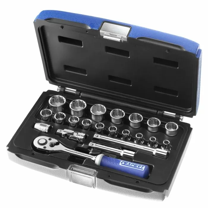 - Douilles 3/8" 12 pans : 6-7-8-9-10-11-12-13-14-15-16-17-18-19-21-22-24 mm.- 1 cliquet parcmètre à verrouillage 3/8".- 2 rallonges 3/8" : 75-125 mm.- 1 douille 3/8" porte-embout 1/4".- 1 cardan universel 3/8".- Livré en boîte compatible tiroir de servante.